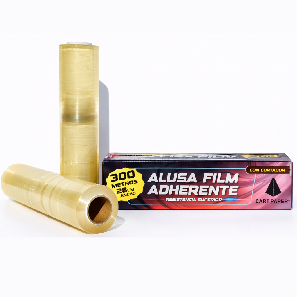 El Alusa Film Adherente Cart Paper® de 300 metros x 28 cm está diseñado para una adherencia superior, asegurando un sellado firme y confiable en todo tipo de alimentos y recipientes.